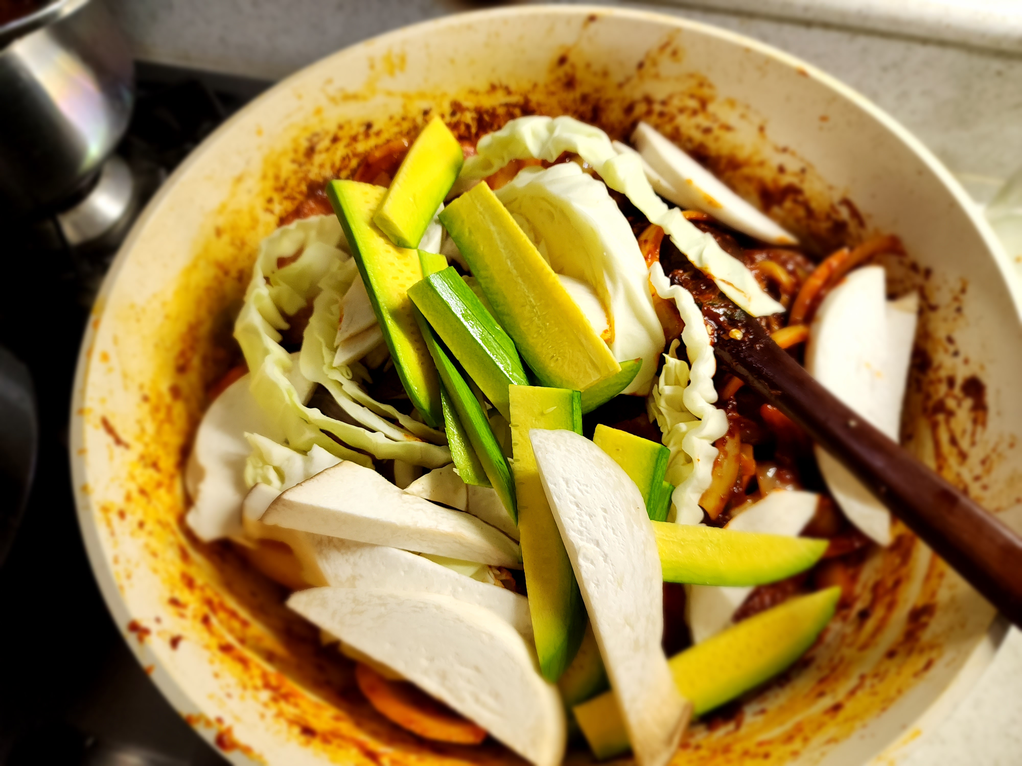 채소가 어느 정도 숨이 죽으면 오징어를 넣고 휘휘.. 불을 잠깐 올려 볶다.. 양념이 돌고 숨이 살짝 죽으면 약불에 잠깐 뜸 들이기... 이 정도래야 양배추가 사각 거린다.
