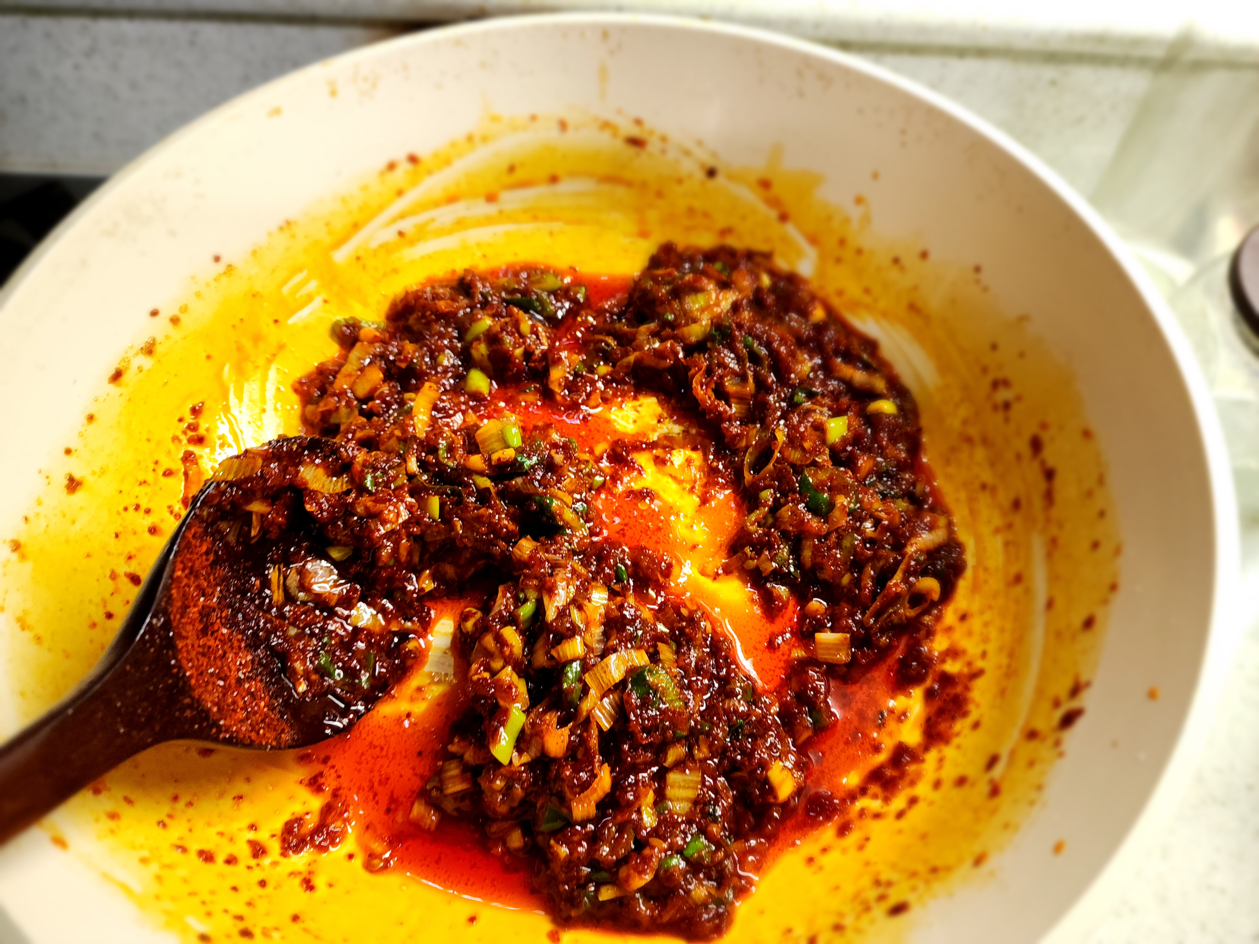 파가 노랗게 익을 때까지 갈팔요는 없다 약간 투명해지면 고춧가루 팍팍... 이때 불을 좀 줄이고...