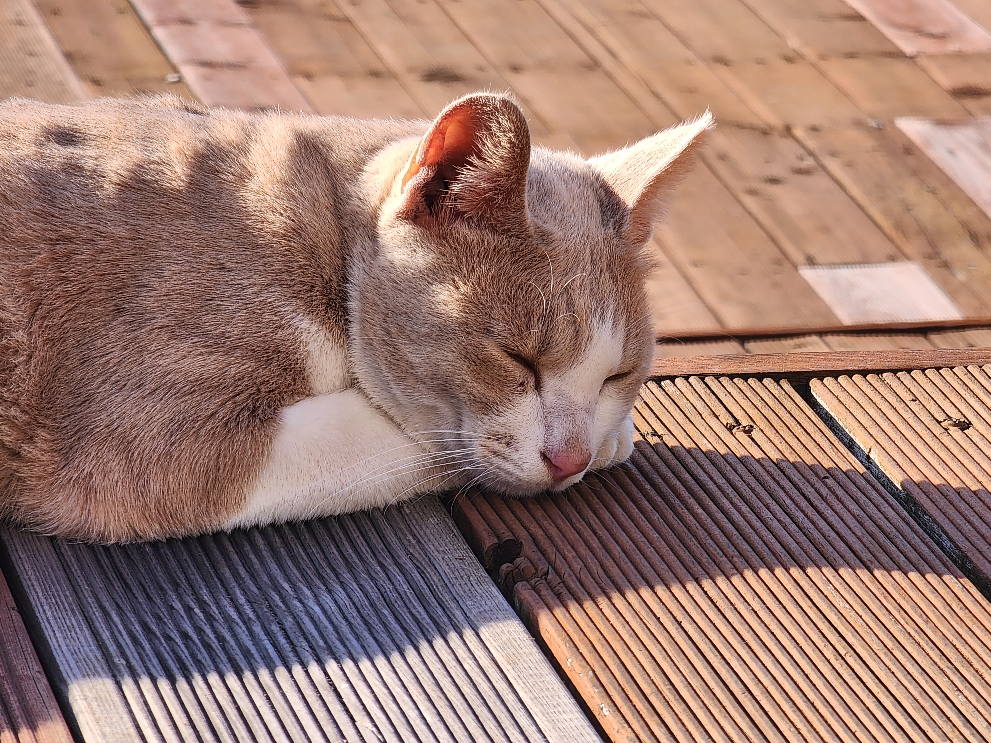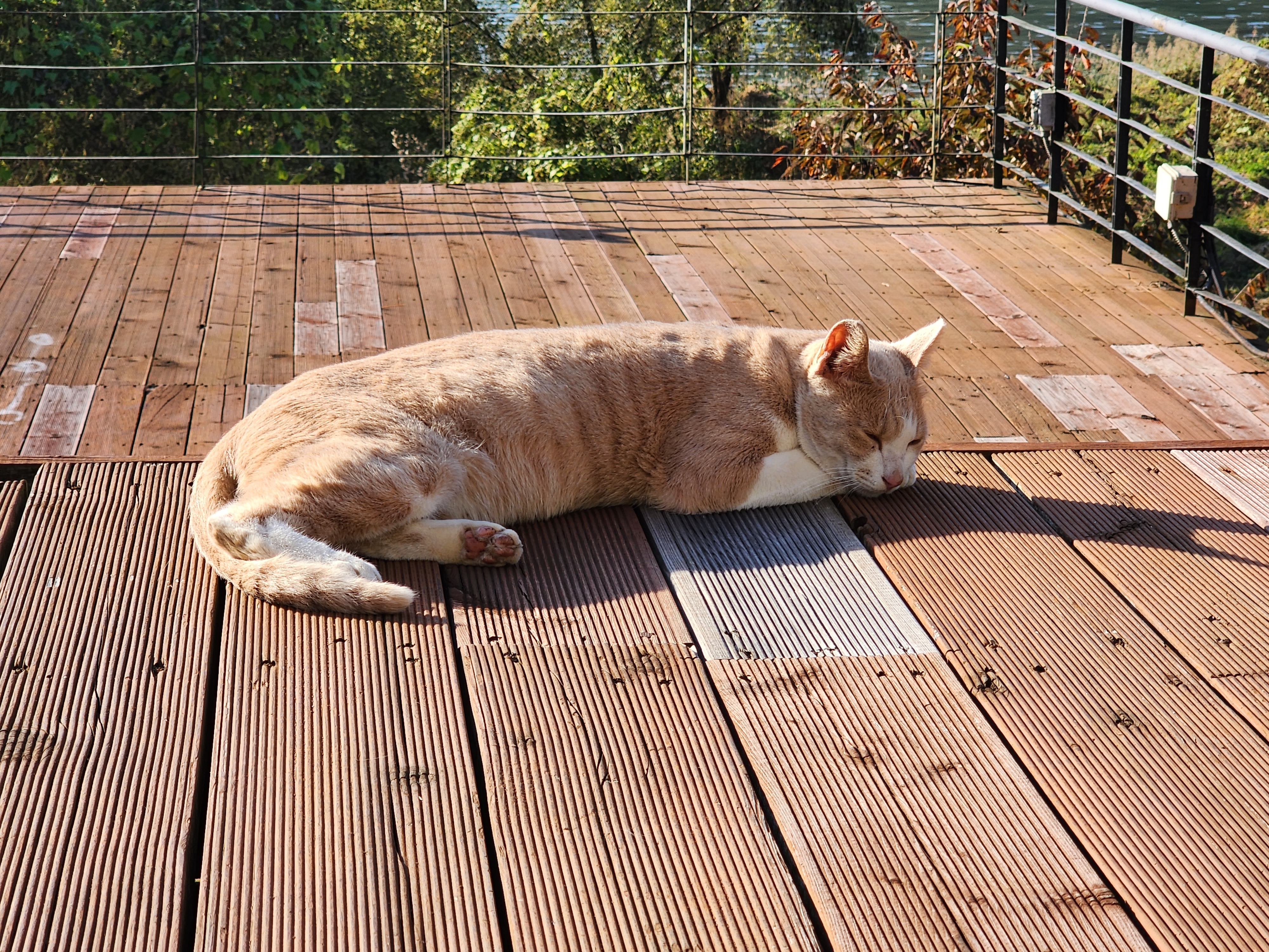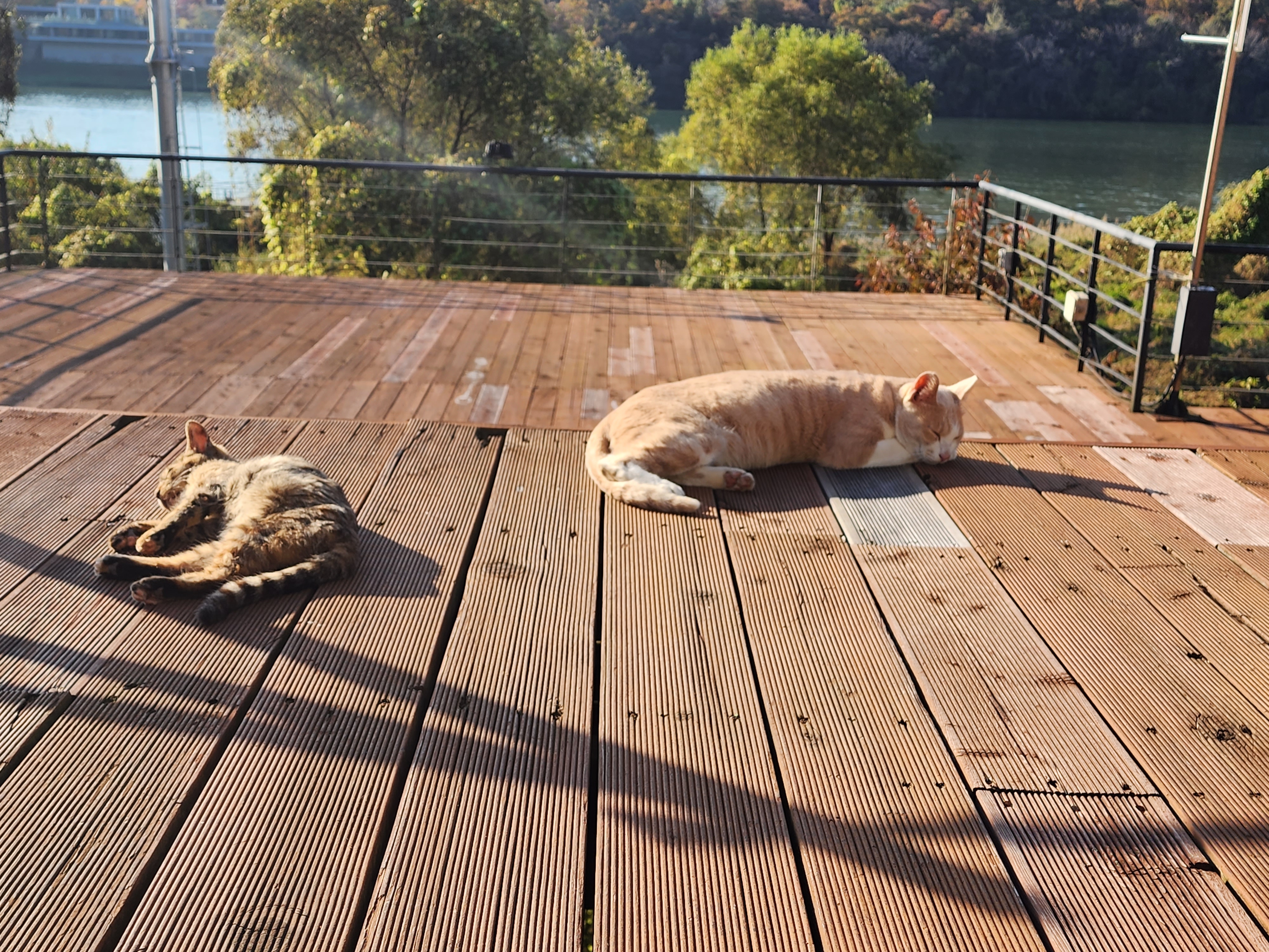야외 데크엔 개냥이들이 한가로이 졸고 있다..
